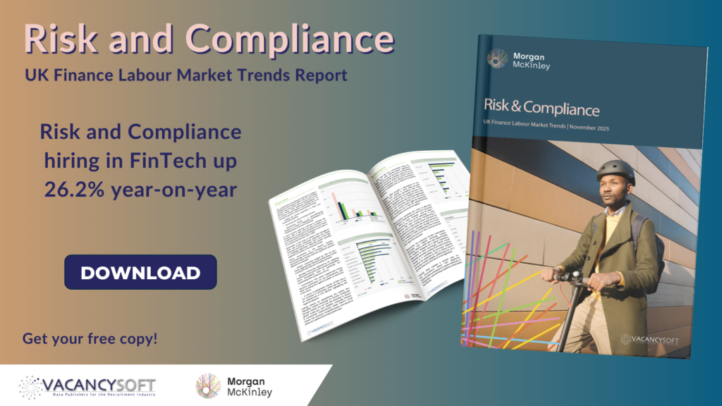 The Risk and Compliance labour market is undergoing a structural shift, as FinTech firms continue to expand while traditional banks consolidate. In 2025, FinTech has recorded its second consecutive year of double-digit hiring growth, with vacancies up by 26.2%, following a similar increase in 2024. In contrast, banking has seen another year of decline, albeit more modest at 1.0%. This divergence has reshaped the hiring landscape: FinTech now accounts for over a fifth of all Risk and Compliance roles, up from just 12.2% in 2023.