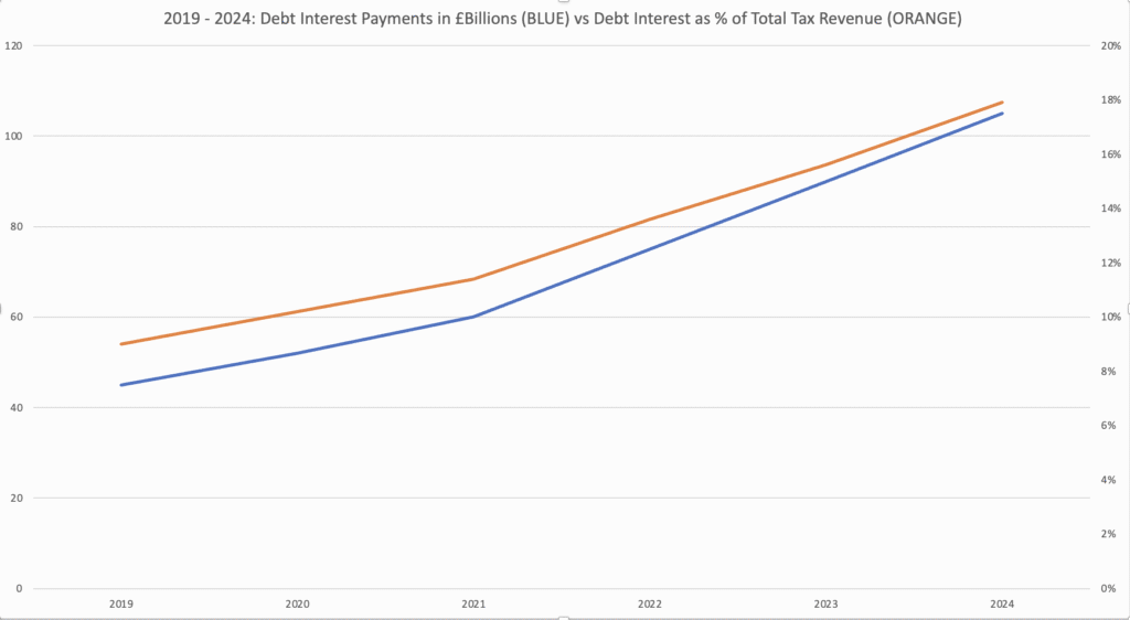 The cost of long-dated UK government borrowing has surged to 5.7%, its highest level in 27 years, raising alarm across financial markets. Economists warn of a potential “doom loop”, where rising debt leads to higher interest payments, consuming a growing share of tax revenues and exacerbating fiscal pressures. With that, factor debt interest payments in 2019 were already making up 9% of the total tax revenue. As of 2024, this had risen to 17.9%.