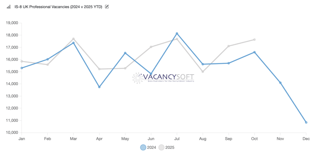 With this in mind, we are launching the IS-8 Vacancy Index, which will monitor professionally qualified vacancies across key industries, providing monthly updates on headline trends. In October, vacancies among the constituent companies reached the second-highest level recorded so far this year. If you would like to know more about how we can help you monitoring the job flows within the IS-8, by sector, location, job type or company even, get in touch, we are well positioned to help.